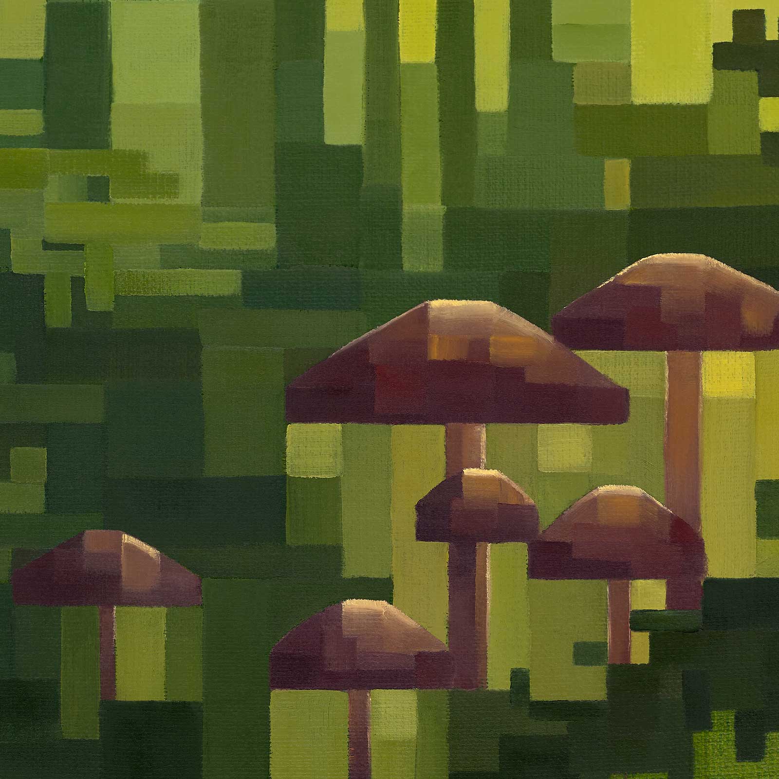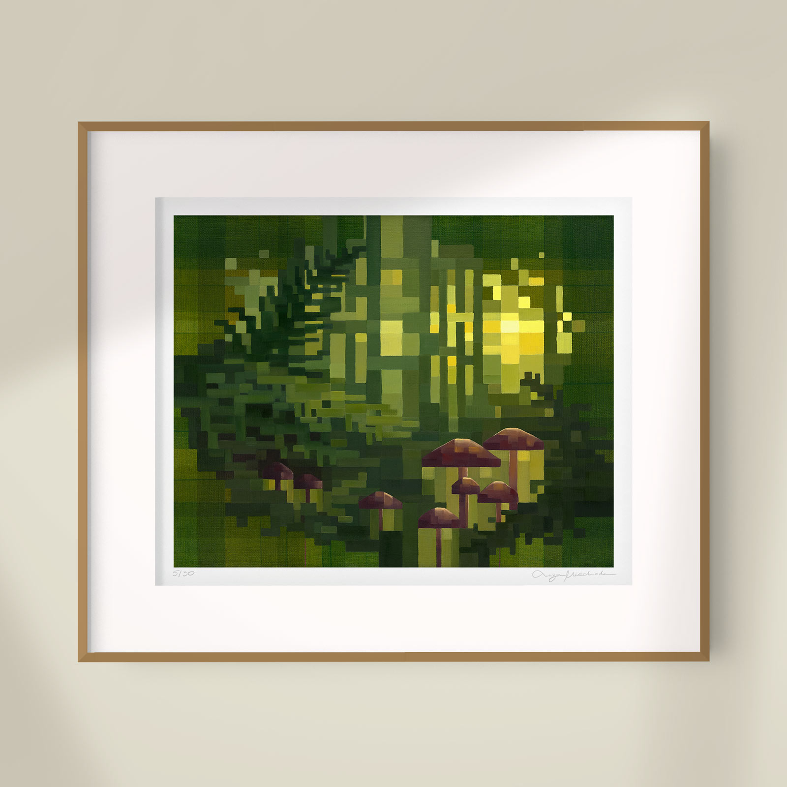 This print is a reproduction of my original mixed media painting on linen, where I layered thin glazes of transparent gesso tinted in blues and greens, creating a subtle plaid flannel pattern beneath a sunlit forest scene. A cluster of mushrooms stands in the foreground like little sentinels, guarding a lush patch of ferns. The sun barely peeks through the trees, casting soft light across the quiet forest floor.