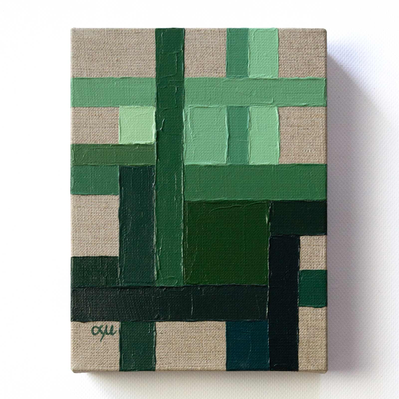 Thick layers of acrylic on exposed linen. Painted with a palette knife.