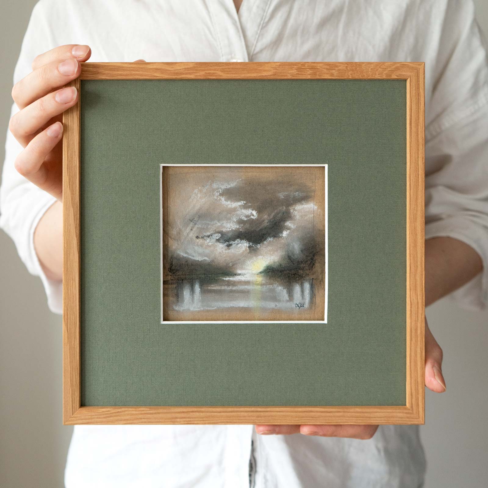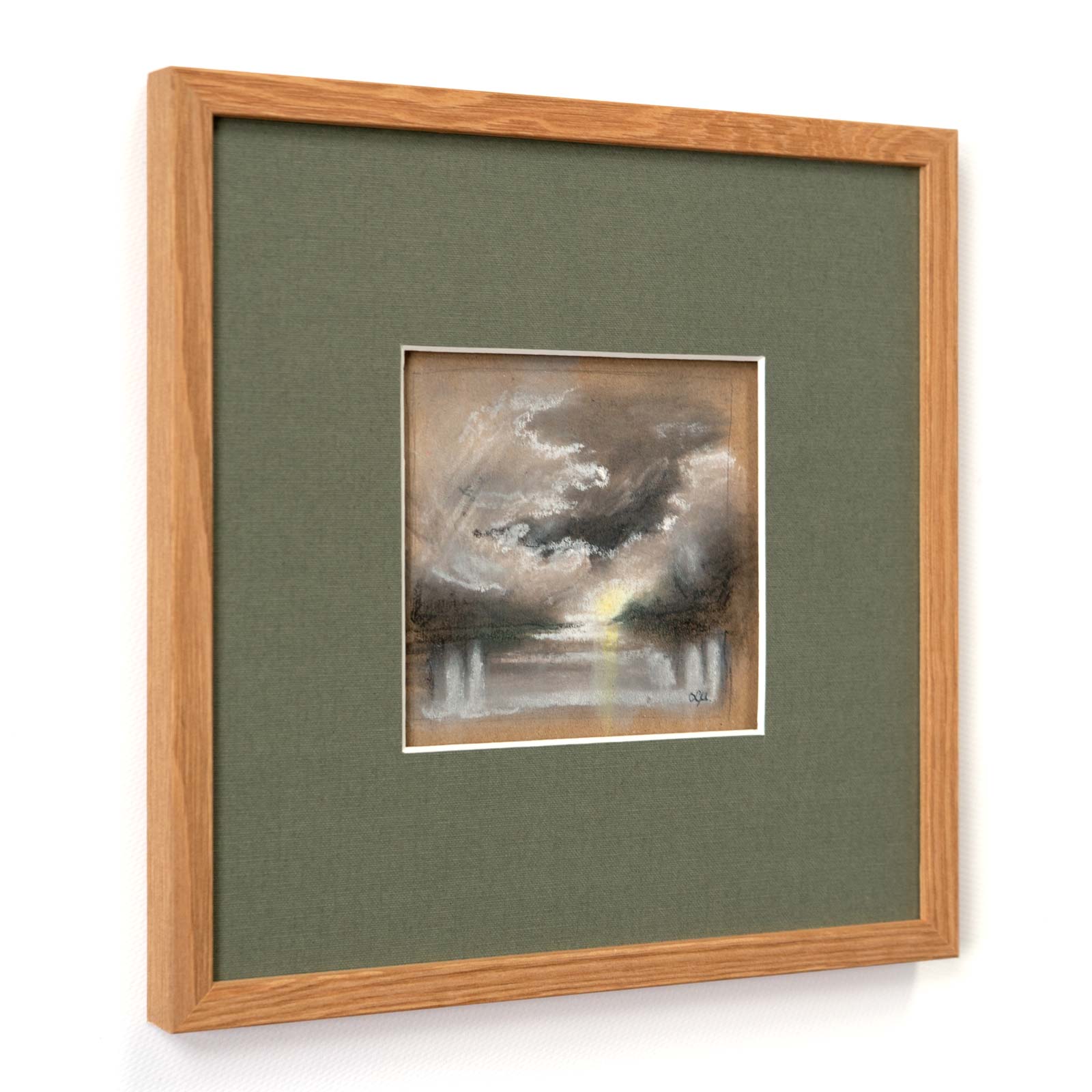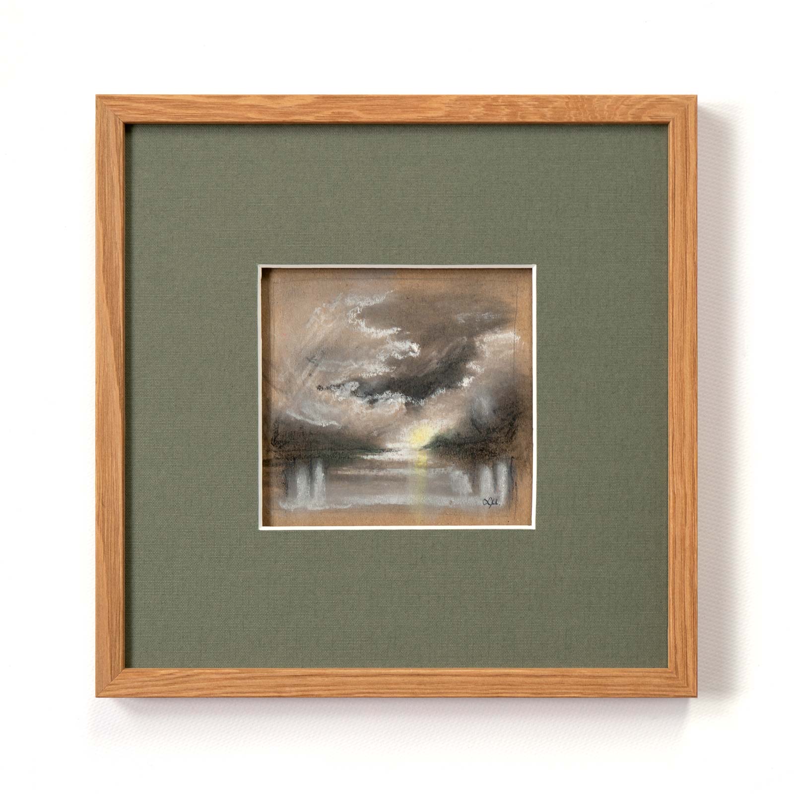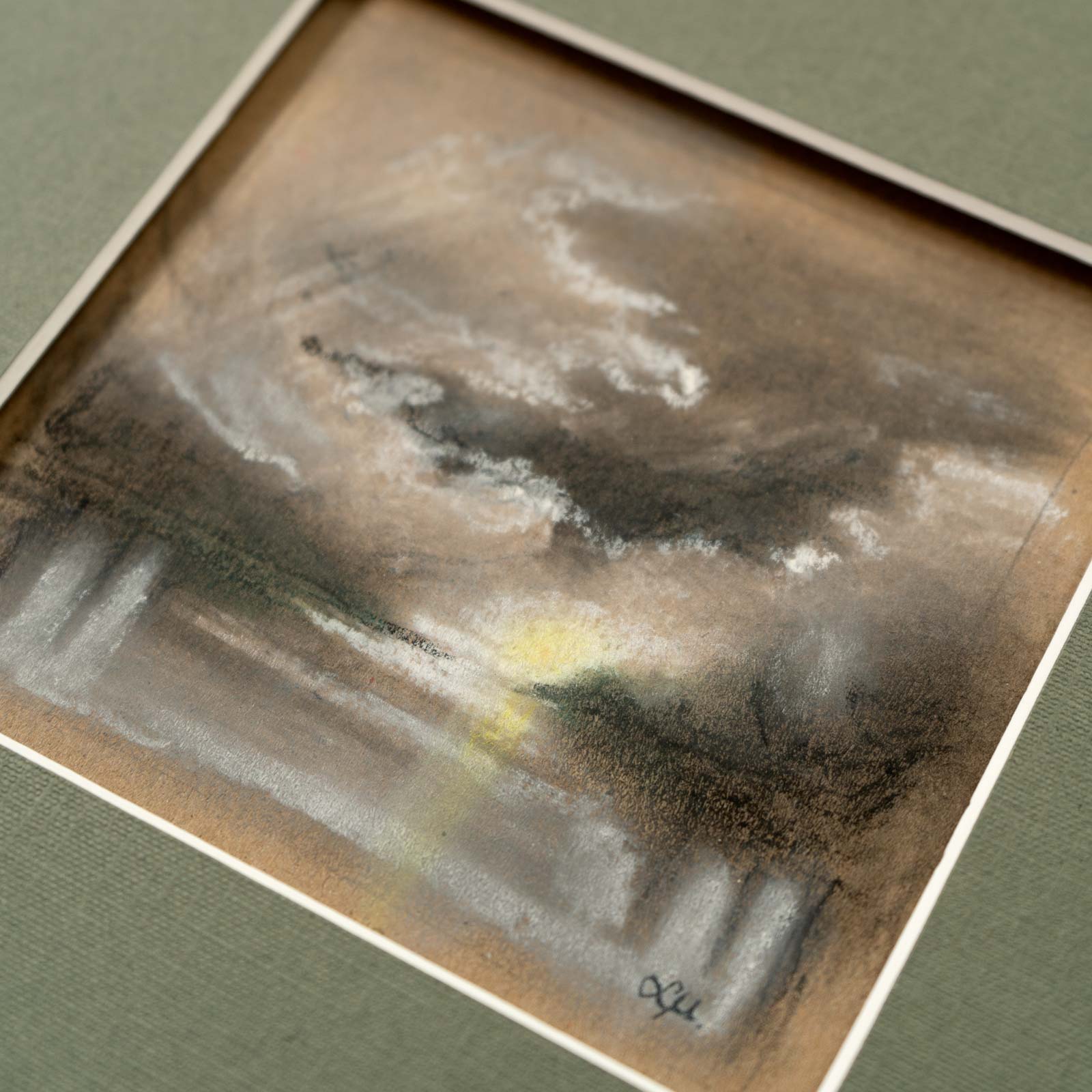 Soft pastel on paper. Framed in a wooden frame with a “floating” mat.